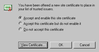 If the certificate issuer is unknown, a browser may not be able to accept the certificate. If the browser accepts the certificate from an unknown certificate authority, it presents the user with several options on how to proceed. The user can view information about the certificate authority that issued the server certificate before accepting it.