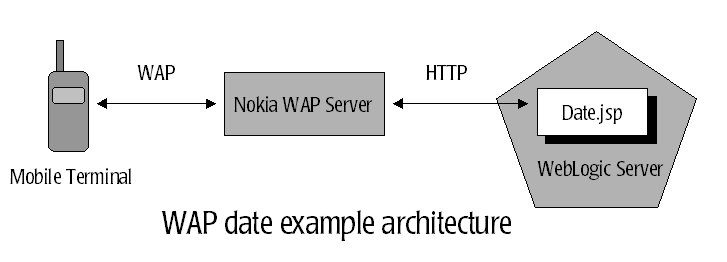 In this example, Date.jsp is accessed by the mobile client (the Nokia WAP simulation client) and displays the current date and time in the client display. Date.jsp is based upon the ShowDate.jsp page of the JSP examles. This page has been modified to generate a WML document instead of an HTML document. The Nokia WAP Server is used as a gateway and converts WML requests received from the client to HTTP Servlet requests that are forwarded to Date.jsp running on WebLogic Server. Date.jsp responds by sending a generated WML document.