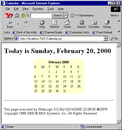 To use Calendar.jsp, your WebLogic Server must be configured to serve JSP pages. Then you compile CalendarBean.java, copy Calendar.jsp into WebLogic Server's document root, and call the page in a browser. Here are the steps: