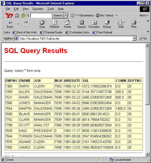 The SqlServlet.java example is a servlet that gets an SQL statement from a browser form, executes the statement using a connection from a WebLogic Server connection pool, and constructs an HTML page containing the query results. Here is an example of the output from this servlet: