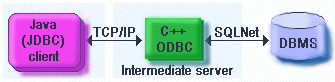 Figure 1-5 JDBC access via a C++ intermediate server and ODBC