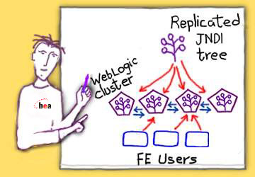 "It's a good question," the Java engineer acknowledged. "But the answer is easy -- can't happen. There's no single point of failure in a WebLogic Server cluster -- the servers in the cluster are peers. Each server has a copy of a cluster-wide JNDI tree. As new services are bound into the tree that information is replicated across the cluster. If one server in the cluster fails, the replicated JNDI tree is updated instantly, and everything keeps on working."