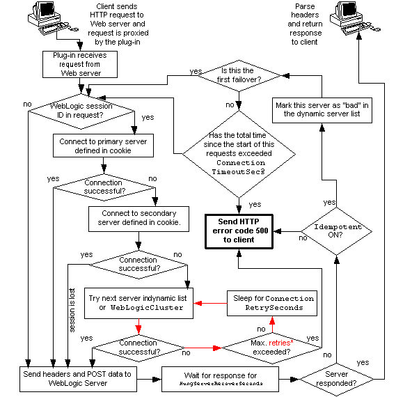 When the Apache HTTP Server Plug-In attempts to connect to WebLogic Server, the plug-in uses several configuration parameters to determine how long to wait for connections to the WebLogic Server host and, after a connection is established, how long the plug-in waits for a response. If the plug-in cannot connect or does not receive a response, the plug-in will attempt to connect and send the request to other WebLogic Servers in the cluster. If the connection fails or there is no response from any WebLogic Server in the cluster, an error message is sent.