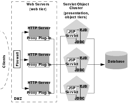 For example, if your web clients make heavy use of servlets and JSPs but access a relatively small set of clustered objects, the multi-tier architecture enables you to concentrate the load of servlets and object appropriately. You may configure a servlet cluster of ten WebLogic Server instances and an object cluster of three WebLogic Server instances, while still fully utilizing each server's processing power.