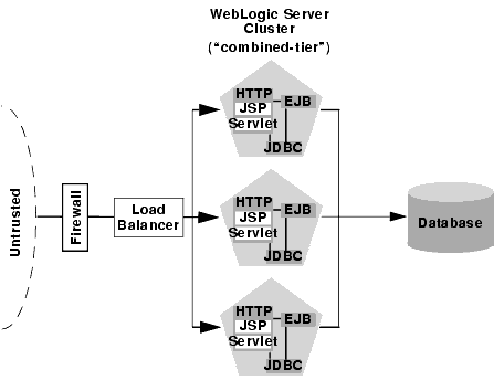 The basic cluster architecture uses a single cluster of WebLogic Server instances to provide all tiers of the web application: web tier, presentation tier, and object tier. In this "combined-tier" cluster, untrusted connections (HTTP and Java clients) have a single interface to the WebLogic Server cluster via load balancing hardware. Although the basic architecture is simplified, it meets the needs of many potential web applications.