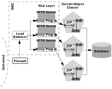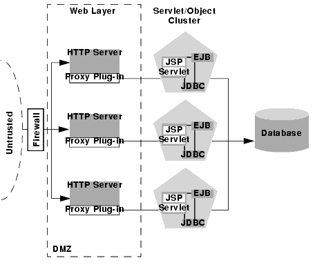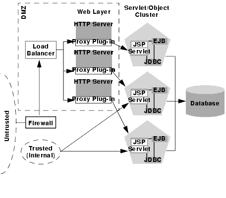 In the above configuration, the single firewall can use any combination of policies (application-level restrictions, NAT, IP masquerading) to filter access to three HTTP servers. The most important role for the firewall is to deny direct access to any other servers in the system. In other words, the servlet layer, the object layer, and the database itself must not be accessible from untrusted clients.