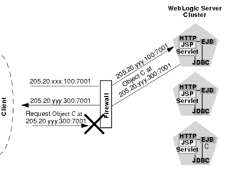 If you place a firewall between the servlet cluster and object cluster in a multi-tier architecture, you must bind all servers in the object cluster to public DNS names, rather than IP addresses. Binding those servers with IP addresses can cause address translation problems and prevent the servlet cluster from accessing individual server instances.