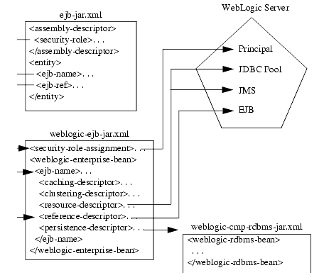 Descriptors in weblogic-ejb-jar.xml are linked to EJB names in ejb-jar.xml, resource names in a running WebLogic Server, and to persistence type data defined in weblogic-cmp-rdbms-jar.xml (for entity EJBs using RDBMS persistence). The following figure shows the relationship among these components.