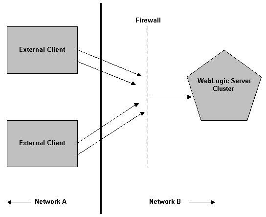 There are many ways to combine firewalls, WebLogic Server, and other network servers. Figure 3-1 illustrates a typical setup with a firewall that filters traffic destined for a WebLogic Server cluster.