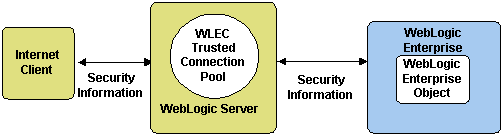 As Figure 1-4 shows, a WLEC connection pool enables you to propagate security information from a client through WebLogic Server to the WLE system: