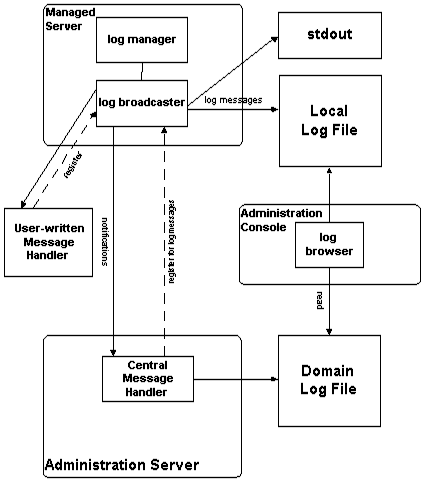 Java Management Extension (JMX) facilities, embedded in the WebLogic Server, are used to transmit log messages from WebLogic Servers to the Administration Server. A message forwarded to other entities on the initiative of a local WebLogic Server is called a notification in JMX terminology.
