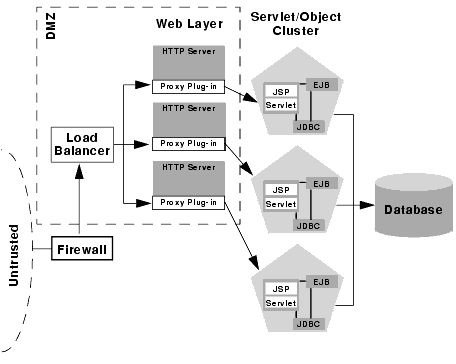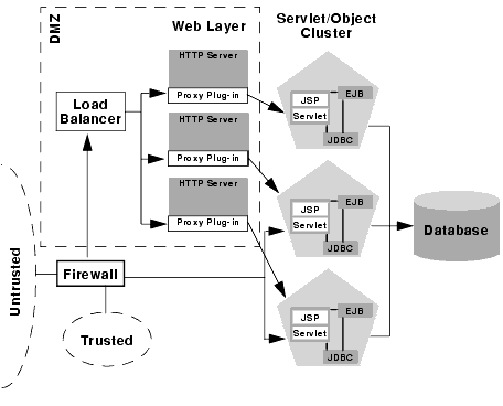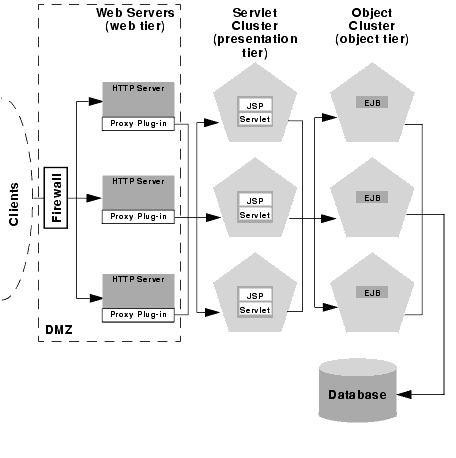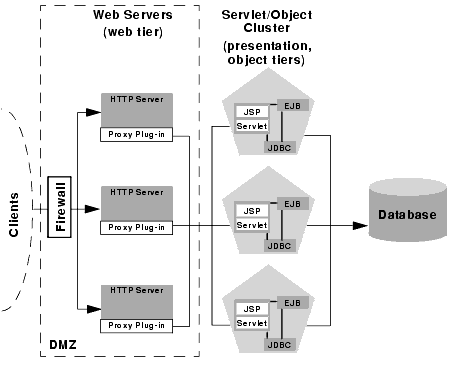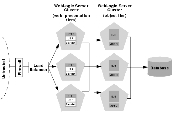 For example, if your Web clients make heavy use of servlets and JSPs but access a relatively small set of clustered objects, the multi-tier architecture enables you to concentrate the load of servlets and object appropriately. You may configure a servlet cluster of ten WebLogic Server instances and an object cluster of three WebLogic Server instances, while still fully utilizing each server's processing power.