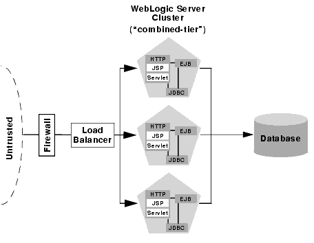 The basic cluster architecture uses a single cluster of WebLogic Server instances to provide all tiers of the web application: web tier, presentation tier, and object tier. In this "combined-tier" cluster, untrusted connections (HTTP and Java clients) have a single interface to the WebLogic Server cluster via load balancing hardware. Although the basic architecture is simplified, it meets the needs of many potential Web applications.