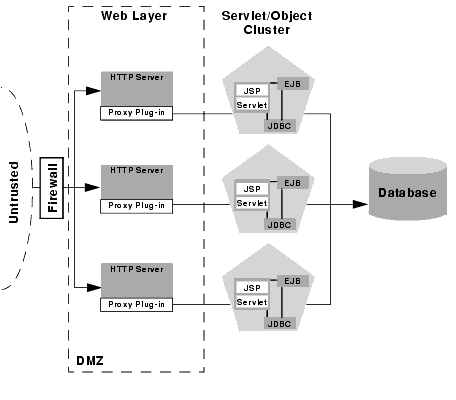 In the above configuration, the single firewall can use any combination of policies (application-level restrictions, NAT, IP masquerading) to filter access to three HTTP servers. The most important role for the firewall is to deny direct access to any other servers in the system. In other words, the servlet layer, the object layer, and the database itself must not be accessible from untrusted clients.