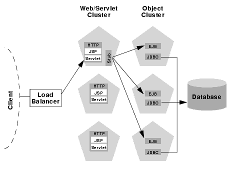 To utilize load balancing for method calls to clustered EJBs, you must split the presentation and object tiers of the Web application onto separate physical clusters. This is described in Recommended Multi-Tier Architecture below.