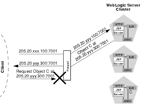 If you place a firewall between the servlet cluster and object cluster in a multi-tier architecture, you must bind all servers in the object cluster to public DNS names, rather than IP addresses. Binding those servers with IP addresses can cause address translation problems and prevent the servlet cluster from accessing individual server instances.