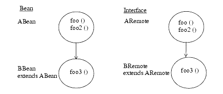 Also, EJBs inheriting from other EJB implementations change the interfaces. For example, the following figure shows a situation where a derived bean adds a new method that is meant to be accessible remotely: