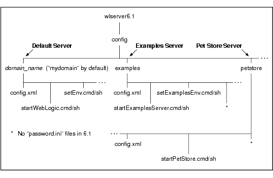 Figure 7-1 WebLogic Server Directory Structures for the Default, Examples, and Pet Store Servers