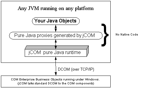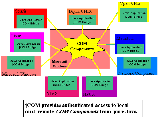WebLogic jCOM's Java-COM bridging capabilities allow COM access from and to Java objects that are running on any operating system environment.