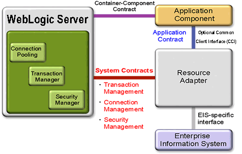 The J2EE Connector Architecture specification defines a set of system-level contracts between the J2EE-compliant application server (WebLogic Server) and an EIS-specific resource adapter. WebLogic Server, in compliance with this specification, has implemented a set of defined standard contracts for: