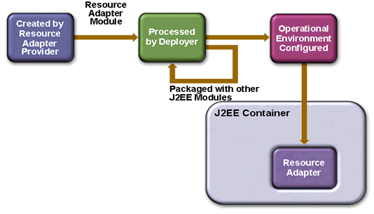 A resource adapter provider develops a set of Java interfaces and classes as part of its implementation of a resource adapter. These Java classes implement J2EE Connector Architecture-specified contracts and EIS-specific functionality provided by the resource adapter. The development of a resource adapter can also require use of native libraries specific to the underlying EIS.