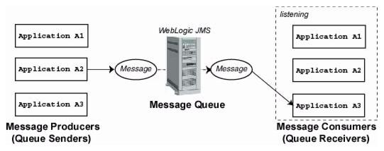 If multiple queue receivers are listening for messages on a queue, WebLogic JMS determines which one will receive the next message on a first come, first serve basis. If no queue receivers are listening on the queue, messages remain in the queue until a queue receiver attaches to the queue.