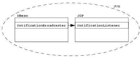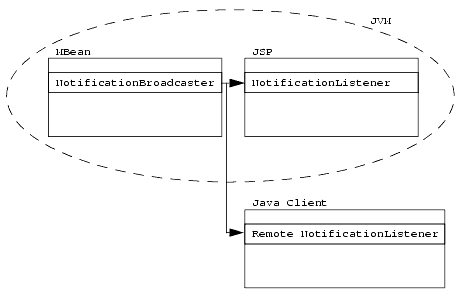 To observe MBean notifications, you simply implement the NotificationListener interface in your client application, and register the listener class with the MBeans whose notifications you want to receive. The figure below shows a basic system to monitor notifications using a JSP or Servlet.