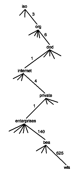 You can find mnemonic or textual equivalents of OID nodes in the WebLogic private MIB by consulting the WebLogic ASN.1 file. The textual equivalent for 625, the WebLogic Server node in the registration tree (.1.3.6.1.4.1.140.625), is wls.