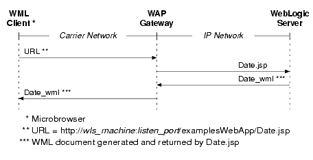 The WAP gateway converts WML requests received from the client to HTTP Servlet requests and then forwards the converted requests to Date.jsp running on WebLogic Server. Date.jsp responds by determining the current date and time and returning the results in the following WML document.