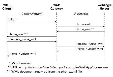 The query parameter name is added to the servlet's URL. In this example, PhoneServlet generates a WML response from a text file named phonelist, located in the samples/examples/servlets directory of your WebLogic Server installation, and the WAP gateway forwards the response to the WML client. The following figure helps clarify the phoneBook application flow and user input.