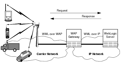 Requests from WML clients are routed through the WAP gateway to WebLogic Server in the form of HTTP requests. WebLogic Server can respond to HTTP request by serving static files or HTTP Servlets written as JSP or Java Servlets. For WAP applications, static files will be WML files, while JSPs and servlets will be used to generate WML dynamically.