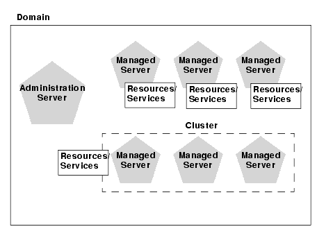 In addition to the Administration Server and Managed Servers, a domain also contains the resources and services required by Managed Servers and hosted applications deployed in the domain.