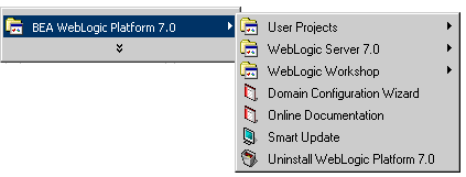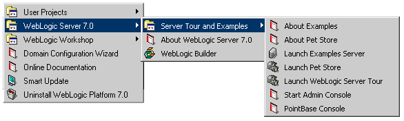 When you install WebLogic Server on a Windows system, the installation program automatically creates shortcut files on the Start Menu. Options on the Start Menu vary according to options you select during installation. The WebLogic Platform 7.0 folder (Start