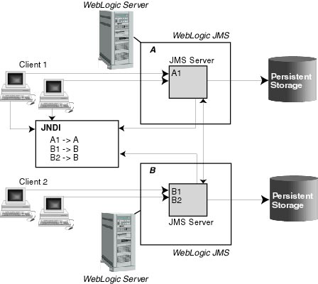 Note: Load balancing is not dynamic. During the configuration phase, the system administrator defines load balancing by specifying targets for JMS servers.