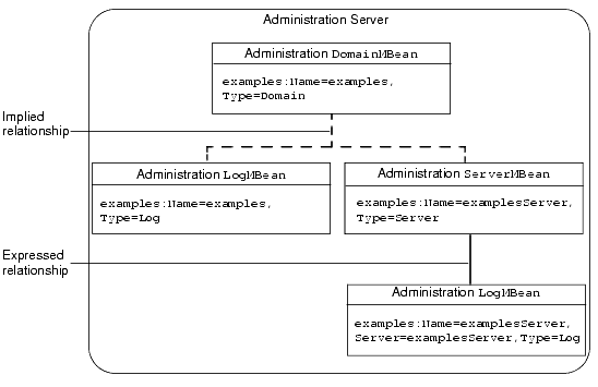 Figure 2-1 illustrates that one instance of LogMBean is a child of DomainMBean and is used to manage the domain-wide log file. Another instance of LogMBean is a child of a server instance's ServerMBean and is used to manage the server-specific log file. The TypeOfParentMBean=NameOfParentMBean component of the WebLogicObjectName removes any ambiguity in the application of an MBean instance.