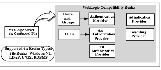 Note: If you are upgrading from a 6.x release to the 7.0 release, your out-of-the-box experience begins with a Compatibility realm—which is initially defined as the default realm—to allow you to work with your existing configuration. Because the 6.x model is deprecated, you need to upgrade your security realm to the 7.0 model. For information about upgrading, see "Upgrading Security" under "Upgrading WebLogic Server 6.x to Version 7.0" in the Upgrade Guide for BEA WebLogic Server 7.0.