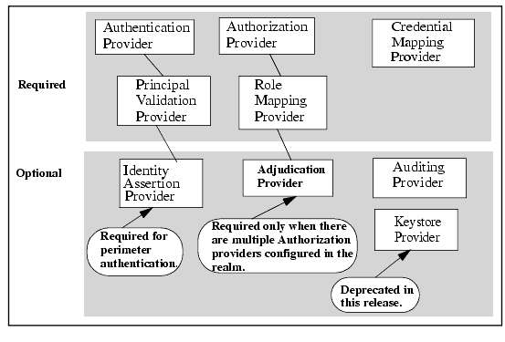 Because security providers are individual modules or components that are "plugged into" a WebLogic Server security realm, you can add, replace, or remove a security provider with minimal effort. You can use the WebLogic security providers, custom security providers you develop, security providers obtained from third-party security vendors, or a combination of all three to create a fully-functioning security realm. However, as Figure 3-3 also shows, some types of security providers are required for a 7.0 security realm to operate properly. Table 3-3 summarizes which security providers must be configured for a fully-operational 7.0 security realm.