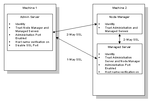 By default, identity and trust for the Administration Server are configured using demonstration digital certificates and private keys provided by the Configuration Wizard. In addition, SSL is configured by default. For more information, see Node Manager SSL Demonstration Configuration: Main Steps. This section describes using the Administration port and production quality identity and trust to configure an Administration Server to use SSL.
