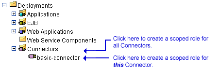 To create a scoped role for all Connectors, right-click Connectors. To create a scoped role for a particular Connector, expand Connectors, then right-click the name of a Connector. Figure 4-6 illustrates where you might click, using the basic-connector as an example.