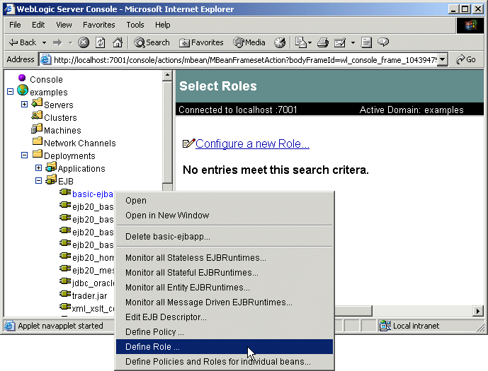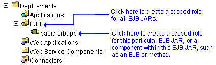 To create a scoped role for all EJB JARs, right-click EJB. To create a scoped role for a particular EJB JAR, or for an EJB within a JAR, expand EJB, then right-click the name of an EJB JAR. Figure 4-7 illustrates where you might click, using the basic-ejbapp JAR as an example.