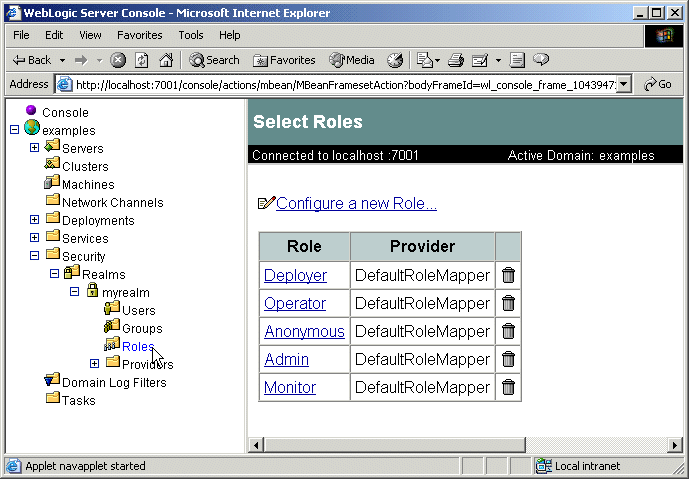 In the left pane of the WebLogic Server Administration Console, right-click the name of the WebLogic Server domain (for example, examples), and choose Define Role... to display the Select Roles page.