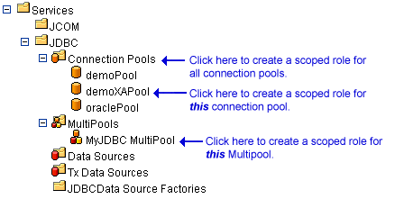 To create a scoped role for all connection pools, right-click Connection Pools. To create a scoped role for a particular connection pool, expand Connection Pools, then right-click the name of a connection pool. To create a scoped role for an individual MultiPool, expand MultiPools, then right-click the name of the MultiPool.