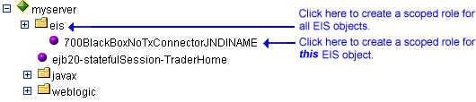 Note: In WebLogic Server 6.x, security roles applied to Web applications and Enterprise JavaBeans (EJBs) only. This version of WebLogic Server expands the use of security roles to all of the defined WebLogic resources. For more information, see Types of WebLogic Resources.