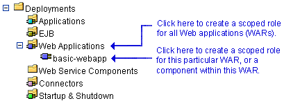 To create a scoped role for all Web applications (WARs), right-click Web Applications. To create a scoped role for a particular WAR or a component in a WAR (for example, a specific servlet or JSP), expand Web Applications, then right-click the name of a Web application (WAR). Figure 4-12 illustrates where you might click, using the basic-webapp WAR as an example.