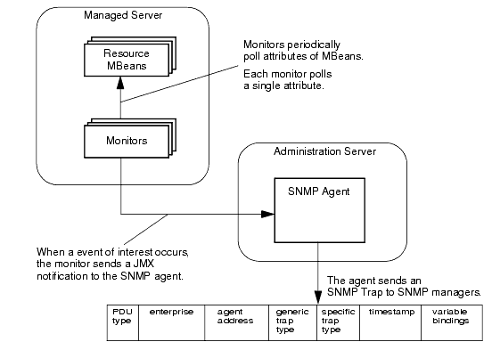 Instead of using an SNMP manager to periodically poll WebLogic resources for changes in conditions, you can configure Java Management Extension (JMX) monitors and assign them to instances of WebLogic Server. The monitors poll the MBeans of WebLogic resources at a specified interval and send notifications to the WebLogic SNMP agent when an event that you specify occurs, such as the crossing of a threshold. The SNMP agent generates a trap notification and sends it to the SNMP managers. (See Figure 2-3.)