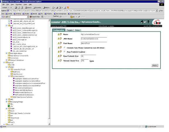 Now we use the WebLogic Server administration console to configure the Data Sources for each of the four EJBs the Smart Ticket application uses.