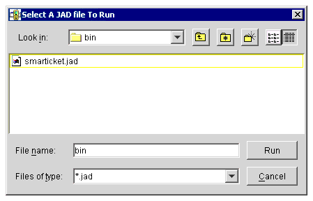 Start SMARTICKET_HOME\bin\smarticket.jad by double-clicking it or by selecting Start | J2ME Wireless Application | Run MIDP Application and selecting it: