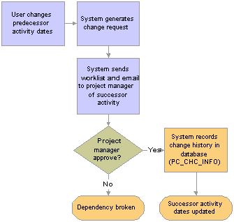 A cross-project dependency exists if you have an activity (successor) in one project that is dependent on an activity (predecessor) in another project. If you change the start date or end date of the predecessor activity that impacts the dates of the successor activity in a different project, the dates of the successor activity are not updated in real-time. The system automatically generates a change request to update the dates of the successor activity and routes the change request to the project manger of the project that contains that successor activity. The project manager has the opportunity to approve or decline the change request. If the project manager approves the change request, the system updates the successor activity dates. If the project manager declines the change request, the system does not update the activity dates and the dependency between the two activities is removed. Cross-project dependency change requests are like activity date change requests, except that they are generated by the system.