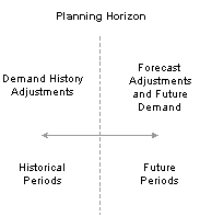 Adjustments are changes that you make to item quantities for forecasts and demand—normally historical demand. Forecasted quantities are those that exist for the current time period and all future periods in the planning horizon. Demand history quantities are those for all past periods.