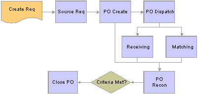 The Close Purchase Orders process occurs at the end of the PeopleSoft Purchasing transaction life cycle. To understand the Close Purchase Orders process, it is important to know where the process fits in the PeopleSoft Purchasing transaction life cycle. This diagram illustrates the transaction flow around the Close Purchase Orders process: